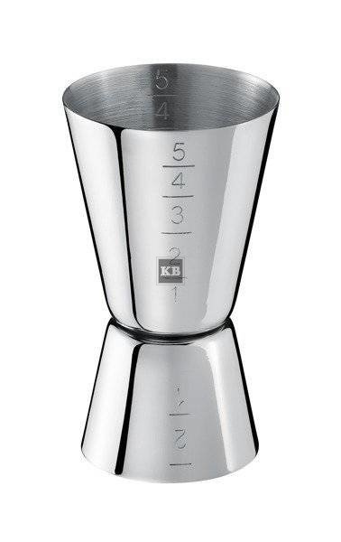 Jigger miarka barmańska o pojemności 20ml i 40ml, wykonana ze stali nierdzewnej 18/10 wysoko polerowanej z podziałkami co 10ml na zewnątrz i wewnątrz miarki.