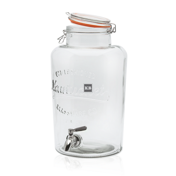 Wysokiej jakości szklany słój z metalowym kranikiem. Pokrywa szczelna z metalowym zamknięciem pozwoli szczelnie zamknąć serwowane napoje.