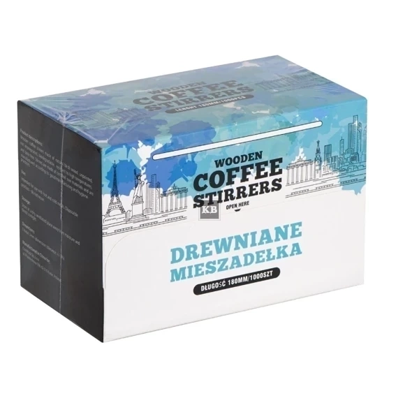Mieszadełka drewniane pakowane w kartonik dł. 18 cm 1000szt. Mieszadełka idealnie nadają się o mieszania kawy, herbaty oraz innych napojów.