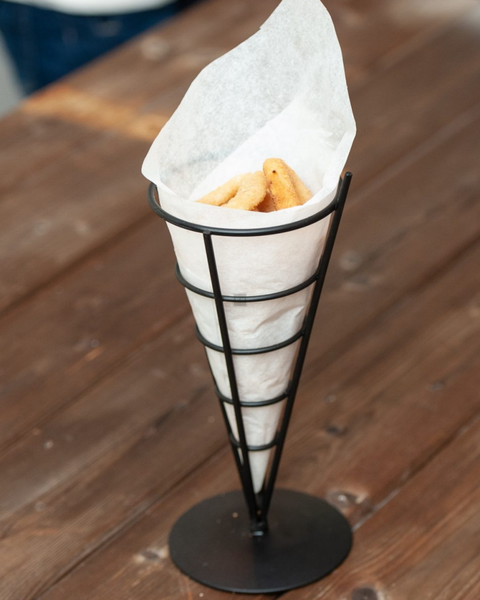 Czarny druciany rożek do serwowania frytek to stylowy i funkcjonalny sposób podawania frytek, przekąsek barowych oraz dodatków. Idealnie sprawdzi się w pubach restauracjach, food truckach oraz w ogródkach gastronomicznych.